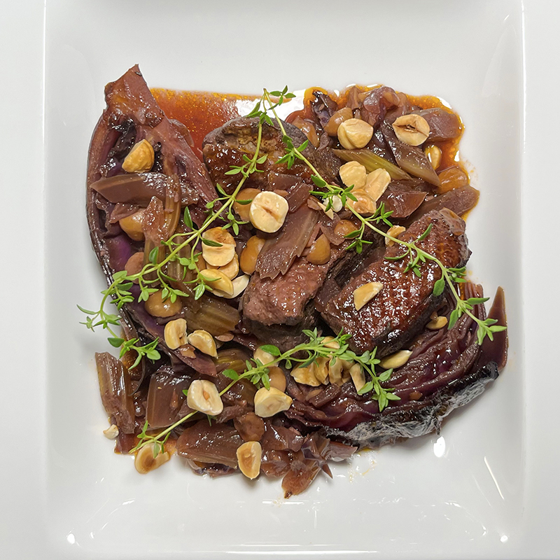 Wir haben dazu Entenbrust und Wirsing-Gemüse und Blatt-Spinat serviert: