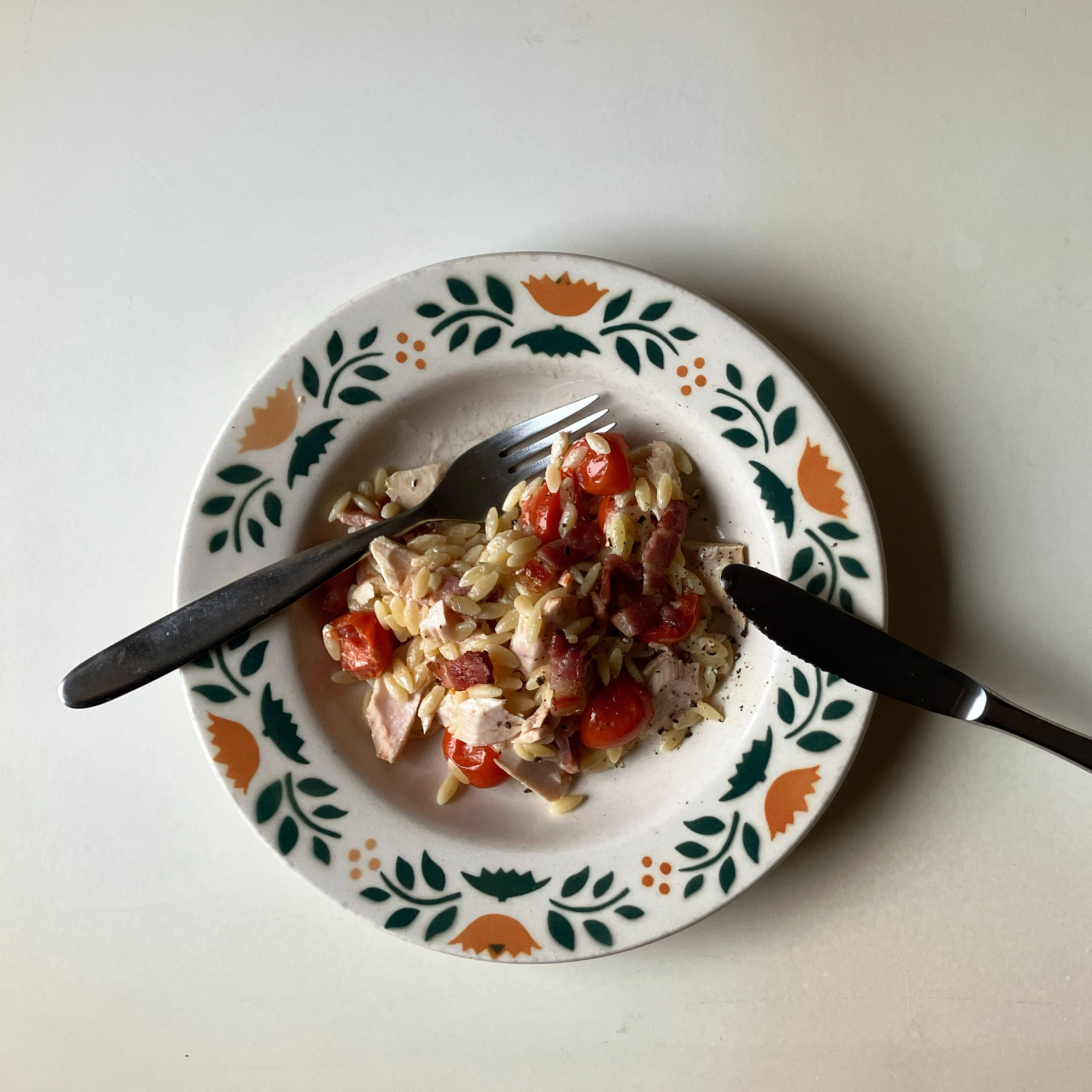 Wir haben dazu gegrillte Lammspiesse gegessen (Lammfilet, mariniert in Olivenöl, Knoblauch und Oregano, mit grünen Oliven aufgespiesst).